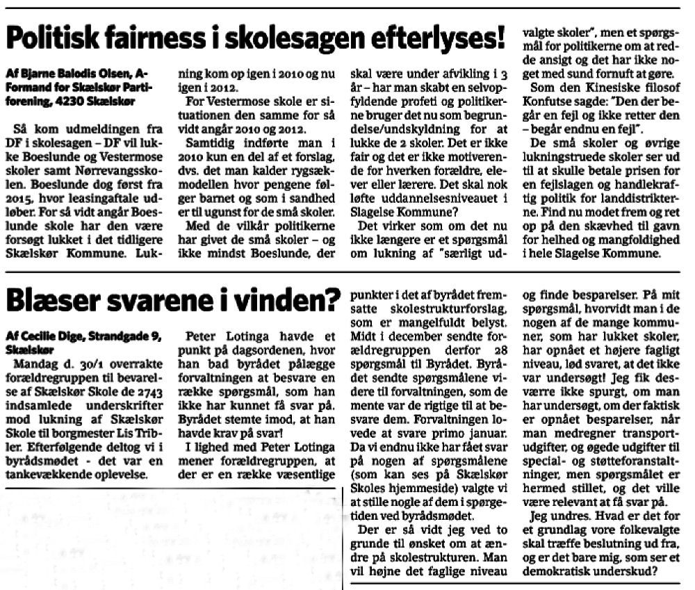 Vi mener man har opnået et godt resultat. Man lukker kun 2 skoler. Det havde ingen gang på jord, at bevare Vestermose Skole og Nørrevangsskolen.