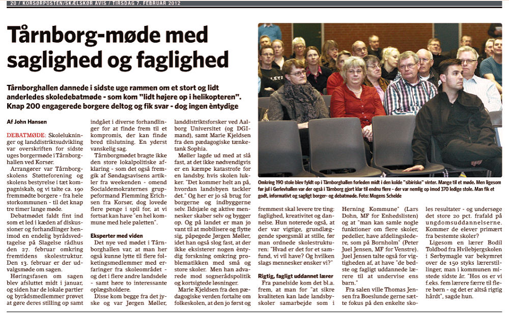 | Tirsdag den 21. februar 2012 Møderne mandag i skoleudvalget og økonomiudvalget endte - ikke uventet - uden noget fællesresultat til en ny skolestruktur | ![]() | ||||||||