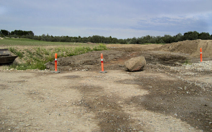 Der ligger en bunke store kampesten - i baggrunden Korsør Kartbanes bygninger. Ørnumvej skimtes til højre i baggrunden.