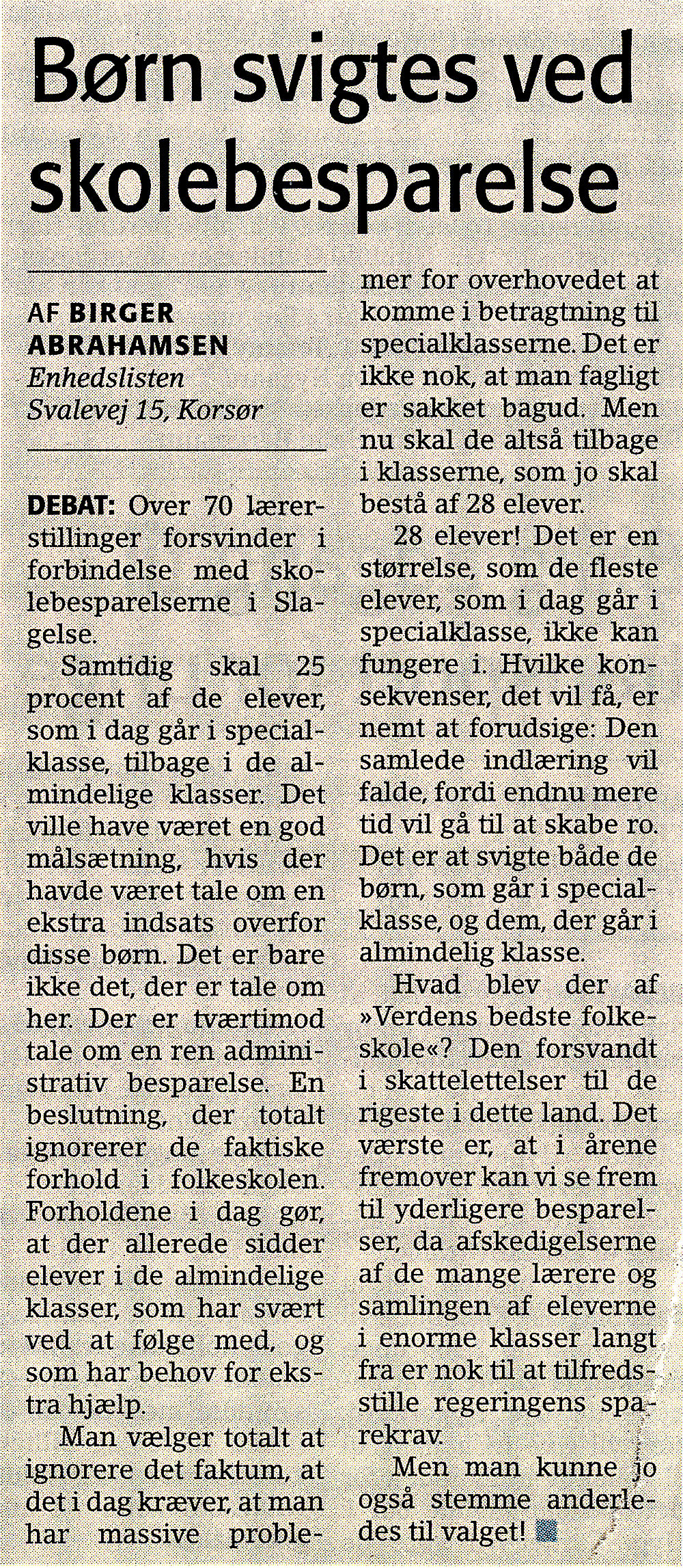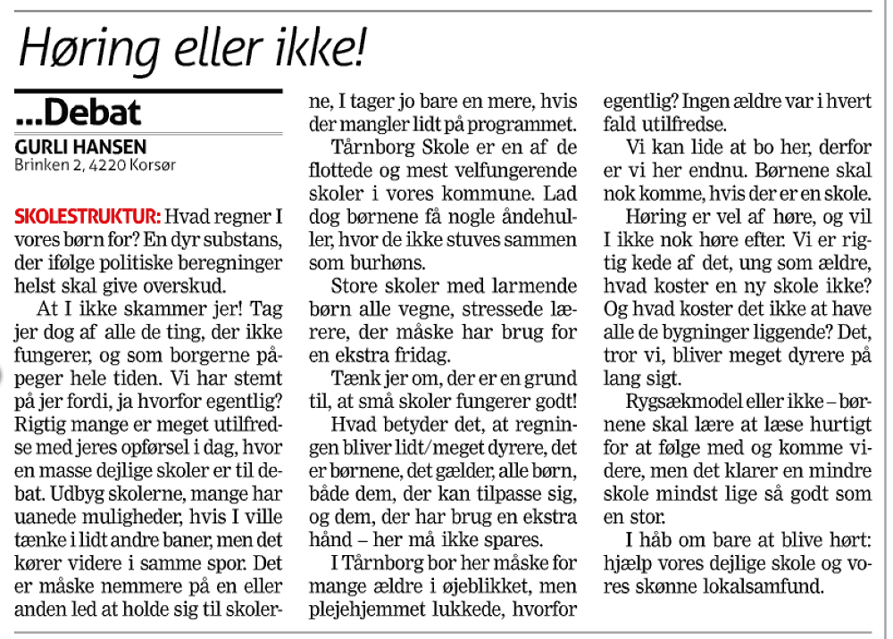 Jeg har lavet et læserindlæg til hjemmesiden og avisen som jeg sender dig som en af de første. (læserindlægget kan du læse i Sjællandske, men du kan se det i et presseklip, som jeg er ved at indsætte på siden - webmaster - DET ER INDSAT PÅ AKTUELT SIDEN nu)