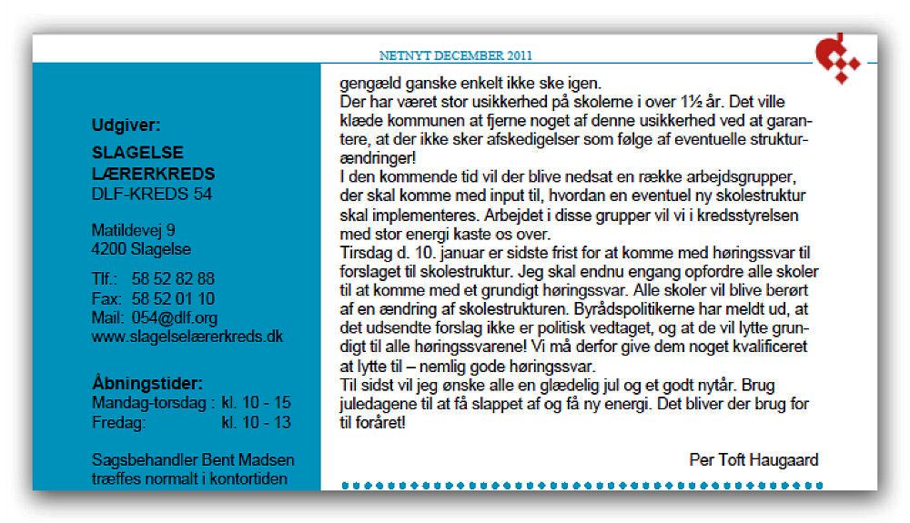 Til morgen hører jeg, at der er regnet 43 milliarder kr. forkert omkring det bebudede underskud på Danmarks national regnskabet for 2011. Jeg spørger på den baggrund, om jeg kan få en samlet oversigt over, hvor mange der bliver fyret i Slagelse kommune, grundet besparelser? Hvis du tror, det kun er på skoleområdet, så bliver du klogere! Når vi er endt i den suppedas omkring skolerne, som vi er – så skyldes det alene, at der sidder små bykonger (det er ikke dig jeg tænker på – du er jo meget mere fremsynet) og forsvarer så små enheder i egen interesse, med den konsekvens, at det kommer til at gå ud over det store flertal af elever!