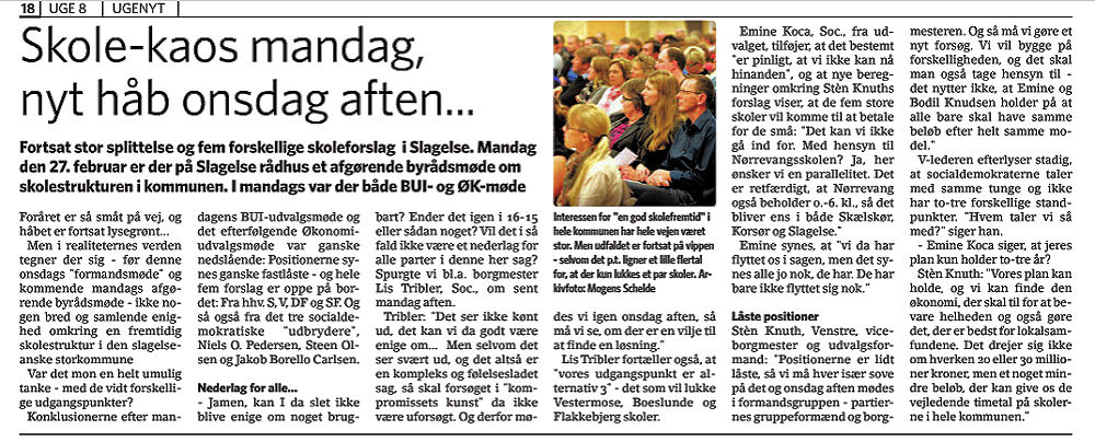 Du kan se dagsordenen/referatet her: http://polweb.nethotel.dk/Produkt/PolWeb/default.asp?p=slagelse&page=document&docId=31003 Der er fremkommet en hel del "morsomme" kommentarer fra byrådsmedlemmer i forbindelse med vedtagelsen af fremtidens skolestruktur. Vi venter lige med bringe disse indtil de er verificerede. Det kan også være de er udtryk for skuffelse over at have lidt nederlag - og det gider vi ikke bringe.