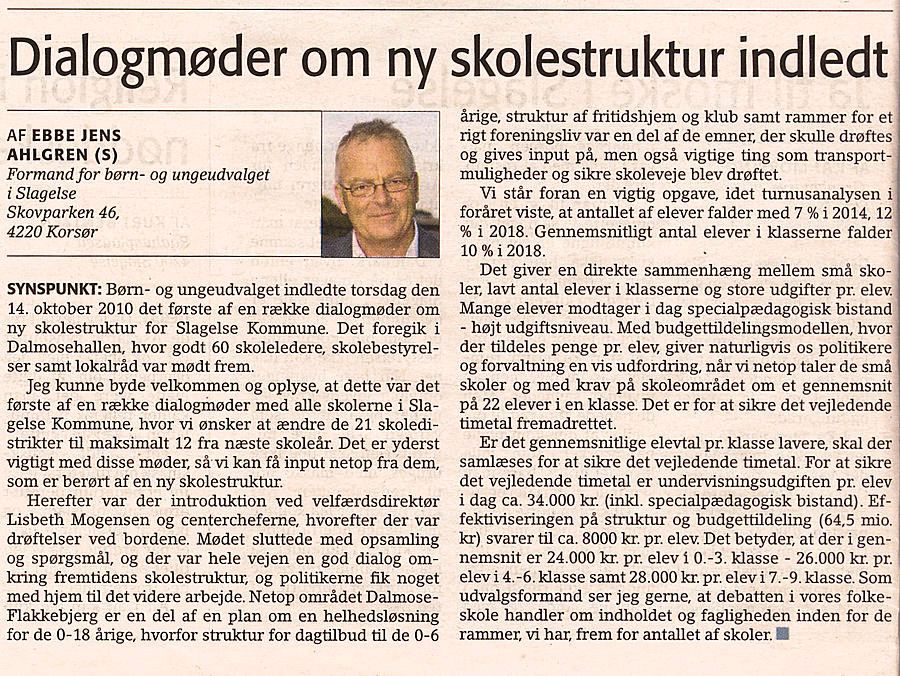 Ebbe Jens Ahlgren, formand børne- og ungeudvalget (Socialdemokraterne) Her er den spritnye Socialdemokratiske udvalgsformand for børne- og ungeudvalget hvorunder skoleområdet sorterer, Ebbe Jens Ahlgren. Ebbe kommer fra Korsør og er forhenværende politimand. Efter samarbejdsvanskeligheder mellem udvalgsmedlemmet Johnny Persson fra Venstre og udvalgsformanden Steen Olsen fra Socialdemokratiet, har socialdemokraterne accepteret at Steen måtte trække sig og lade Ebbe komme til. Det er i sig selv en sag, fordi Ebbe er gået mod sine egne og har sikret sig formandsposten til en årlig gage på 172.000 kr. Det er godt gået, som nyt medlem af Slagelse byråd med beskedne 270 personlige stemmer. Han har dog sikret sig pladsen ved et seriøst målrettet lokalt engagement, som vælgerne har belønnet. Hans force er dog færdselssikkerhed og indsigt i mange problemstillinger fra sit politiarbejde. Steen er nok selv årsag til, at det er kommet så langt. Det bliver Ebbe der i første omgang skal lede forhandlingerne omkring budget 2011 på skoleområdet. Det kan gå hen og blive øretævernes holdeplads. Det er næppe sandsynligt, at oppositionen freder ham. Han er personligt gode venner med venstres Johnny Persson, der også har plads i udvalget. Dette er formentlig direkte årsagen til, at Ebbe kunne komme i spil - det er tænkeligt at Ebbe har truet med at forlade socialdemokratiet og tilslutte sig venstre - vi ved det ikke, men noget voldsomt dramatisk må have været kastet ind i ringen, for at den socialdemokratiske byrådsgruppe og partiforeningernes fællesledelse har accepteret en sådan løsning. Det giver måske lidt ro i første runde. Ved formandsskiftet har man dog fået "lukket luften" ud af venstres og dansk folkepartis kritik. Vi håber han kan løfte opgaven og vor forening ønsker ham lykke og held med opgaven.
